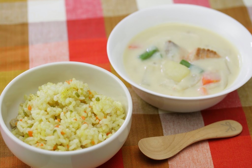 次に、カレーピラフを作って、ホワイトシチューと一緒に食べてみると?