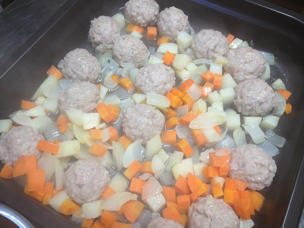 【煮込みハンバーグ】の団子と野菜を合わせて、調味料を加えて加熱。