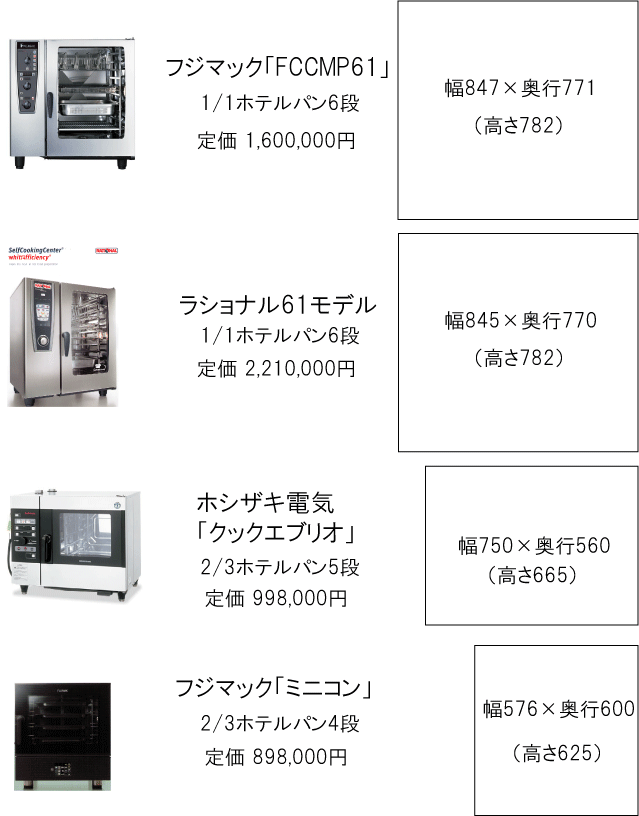 フジマック社の「FCCMP61」モデルは、ラショナルの61モデルからオート調理のデータを簡素化したOEM商品だそうです。だからハード面の性能はラショナル61モデルとほぼ一緒。
