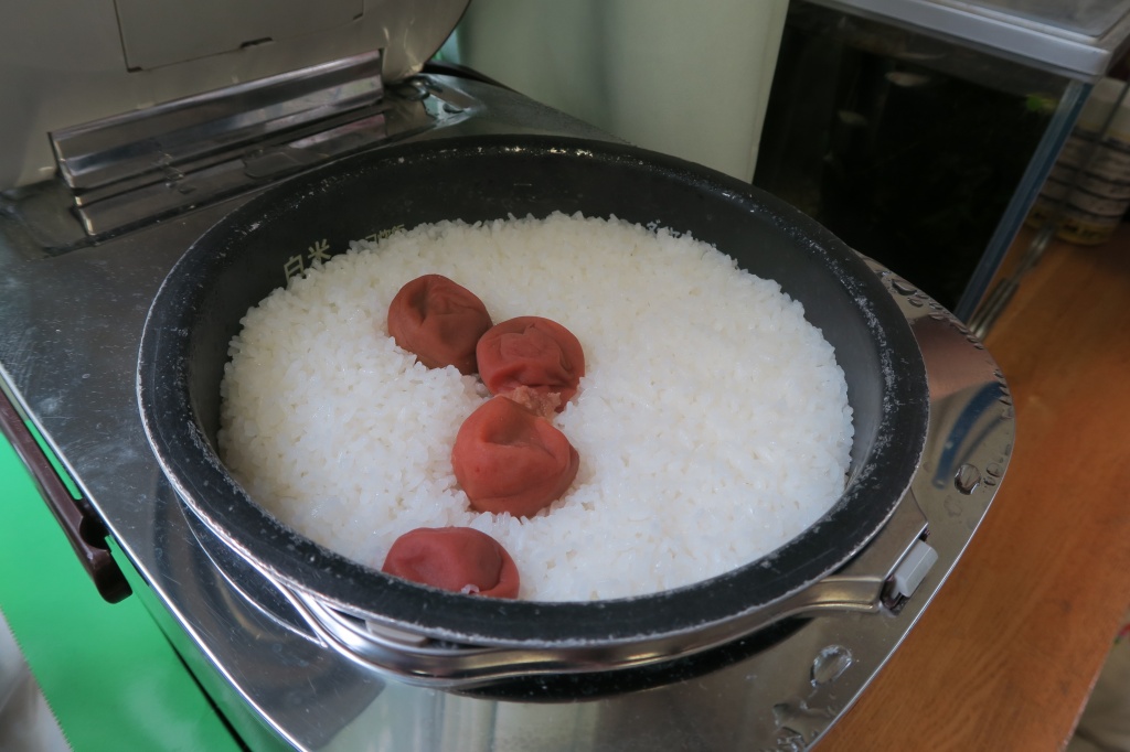 教室の隅におかれた炊飯器から梅ごはんのにおいが教室中に香っています。