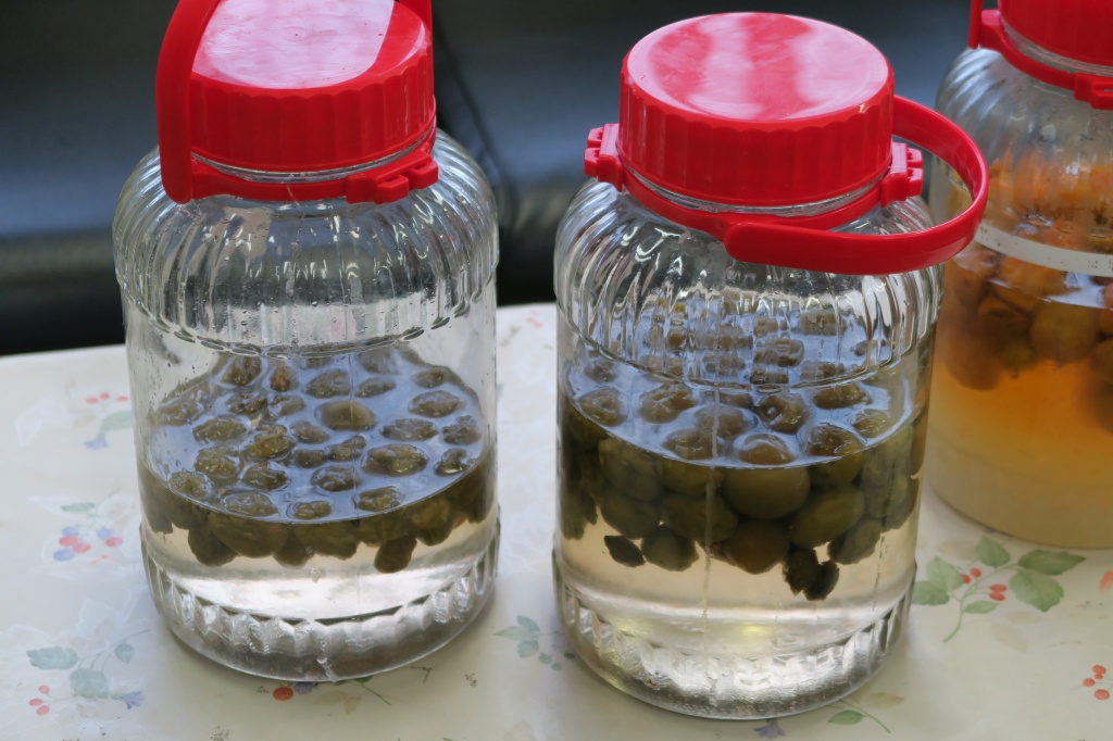 ・庭園でとれた野菜の糠漬けを切って食べる。