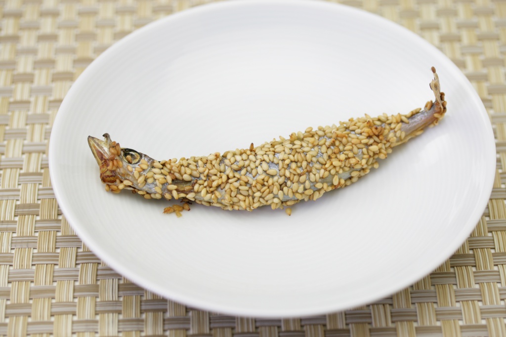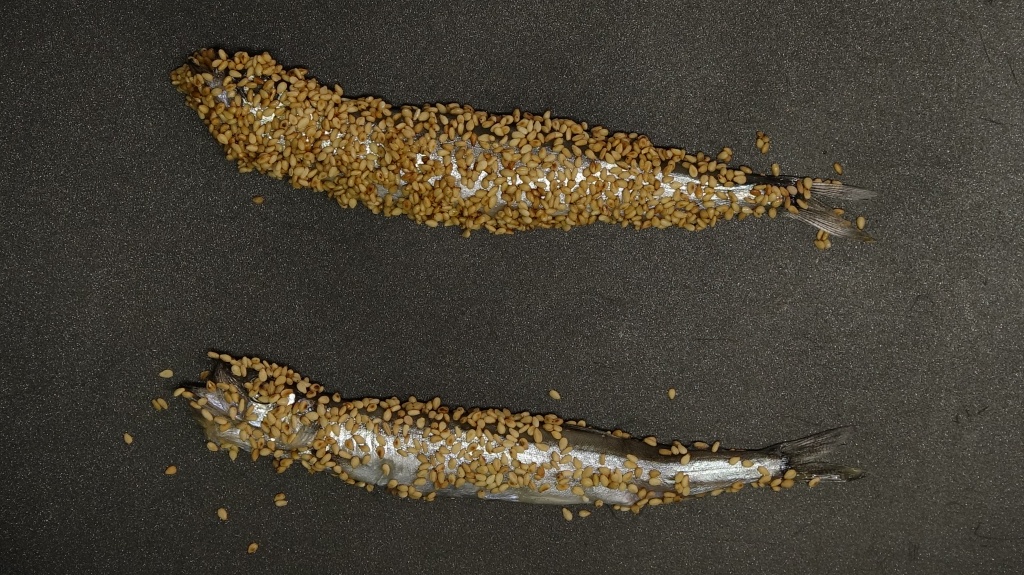 油をぬることで、ごまが落ちにくくなり、子どもたちは頭から食べることに挑戦しやすくなります。もちろん、味的にも食べやすくなります。