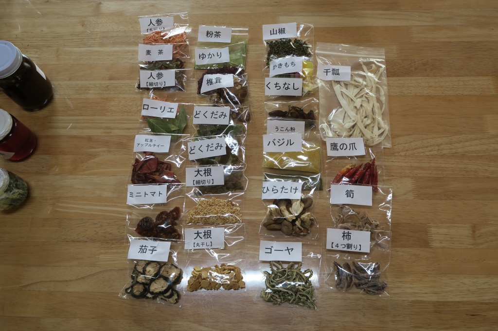 干し野菜の種類は、にんじん、ミニトマト、なす、しいたけ、だいこん、ひらたけ、ゴーヤ、たけのこ等、25種類以上。もちろん冷凍保存も・・。