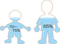 水分は人体の中に豊富に存在していますが、その量は年齢によって異なります。胎児では体重の約80-90%、幼児では約70-75%、成人では約65%とされています。体内の水分の10%が失われると健康障害が起こり、20%が失われると死亡する危険性が高まるとされています。