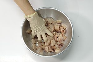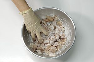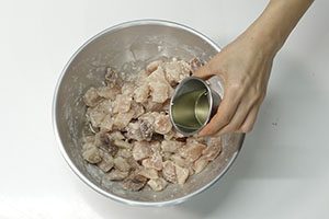 焼いた時に身が締まらないようにするために、酒、片栗粉、油を使います。