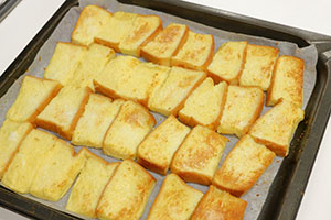 - 卵、牛乳・砂糖を混ぜて、適宜切った食パンを浸して、180℃のオーブンで10分程度焼きます。