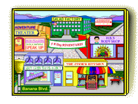 販売会社で、アメリカ合衆国だけではなく、アジアにも拠点を持つ世界的な企業だ。http://www.dole.com DOLE USAが開発した食教育用ソフトは、5 A Day Adventures と名づけられ、5 A DAY運動を強く連想する。 小学校を中心に無償配布された、栄養教育分野のエデュテイメントソフトである。 5 A DAY運動を推進するために、子どもたちが毎日果物と野菜を5サービング食べることを勇気付ける ような内容になっている。 5ADayAdventures CD-ROMは、小学校用の最初の栄養教育ソフトウェアとなり、 これまでに35,000セットが無償で出荷されたという。それが本当ならば、この何十倍もの数の子 どもたちが、小学校で、このソフトウェアを体験していることになる。単体のソフトとしては、 驚異的な数値だ。 ■5 A Day Adventures このソフトを簡単に紹介してみよう。 ソフトを起動すると、スケートボードに乗ったボビーバナナというキャラクターがわれわれを出迎える。 ここで食物のサービング量の基本的な概念をまず学習する。